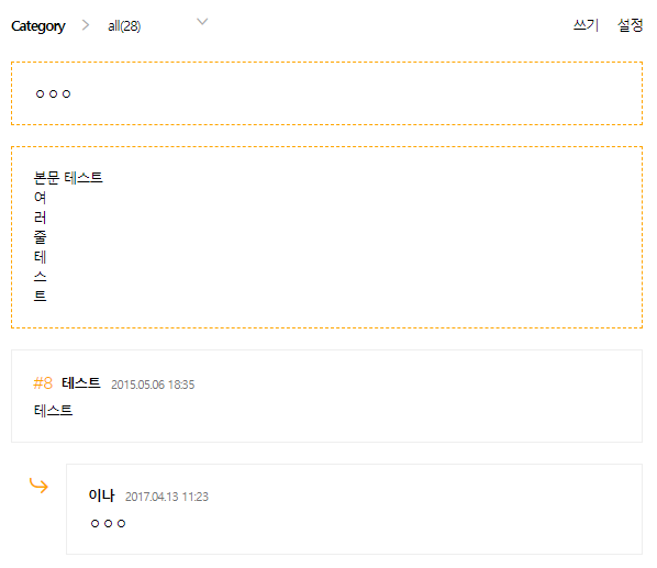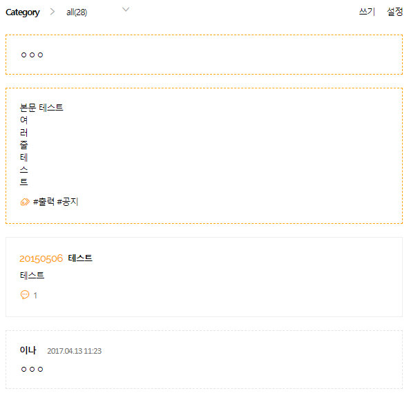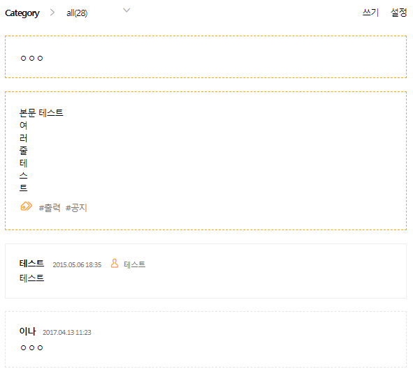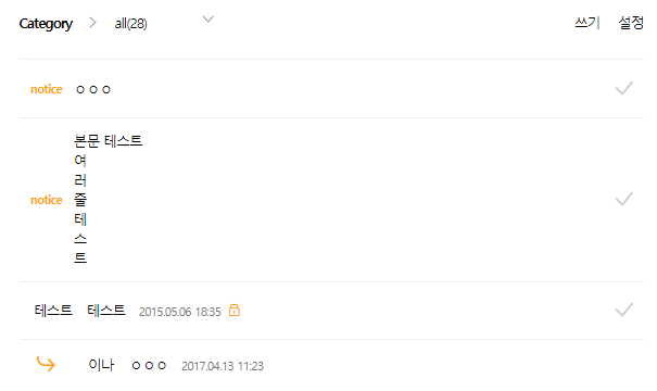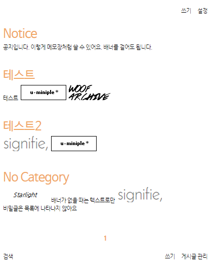 #메모와 일기장에서 제목을 'n' 혹은 'memo'로 설정하면 게시판 설정과 관계없이 제목이 보이지 않습니다.
